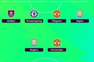 后卫:凯尔-沃克(伯恩利)、阿昌庞(切尔西)、马奎尔(曼联)、迪涅(维拉)
