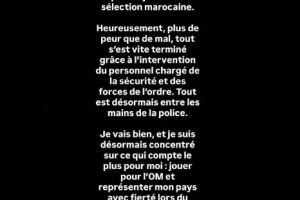 “幸运的是,惊吓大于伤害,事件在安保人员和执法部门的及时介入下迅速平息。目前一切已交由警方处理。我现在很好,也已将注意力重新放在最重要的事情上:为马赛效力,并在即将到来的国家队集训中自豪地代表祖国出战。”
