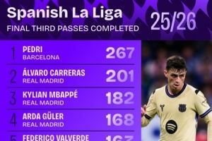 体育资讯10月7日讯 日前,Squawka统计了本赛季西甲进攻三区传球次数排行,佩德里267次居首,5名皇马球员进前十。